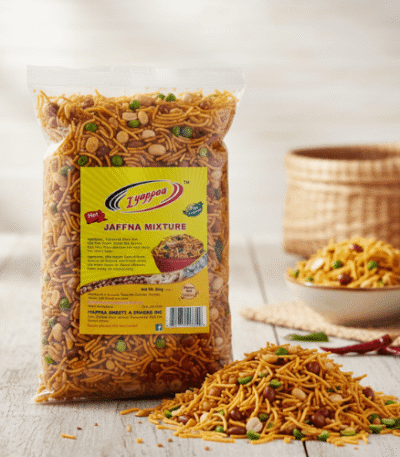 Crunchy and spicy Sri Lankan snack blend with lentils, nuts, and curry leaves, seasoned Jaffna-style for bold flavor in a 600g pack.